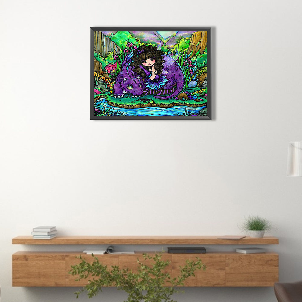 Pixie Girl With Curly Hair And A Purple Dinosaur 40*30CM(Canvas) Full Round Drill Diamond Painting