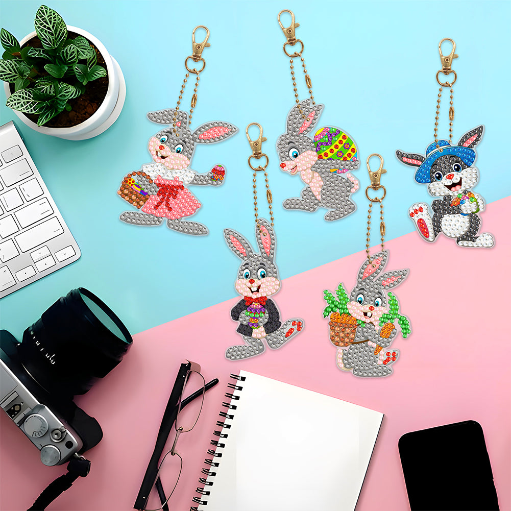 5pcs Car Keychain Art Craft DIY Rhinestone Pendant Double Sided Hanging Ornament Rabbit Pattern for Men Women Boy Girl for Gifts