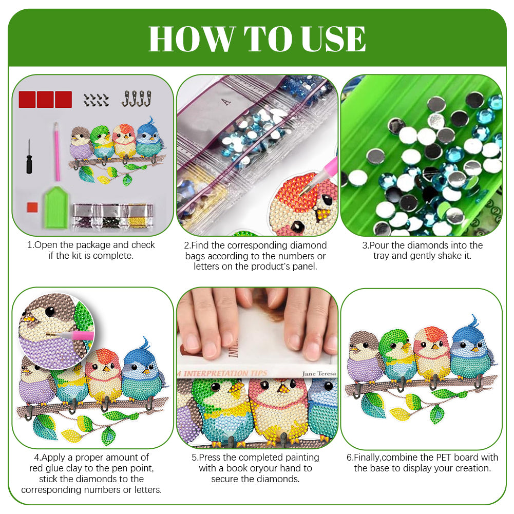 Bird Diamond Art Craft Wall Hooks with 4 Hooks Rhinestone Painting Coat Hook DIY Diamond Painting Art Hooks for Beginners Adults
