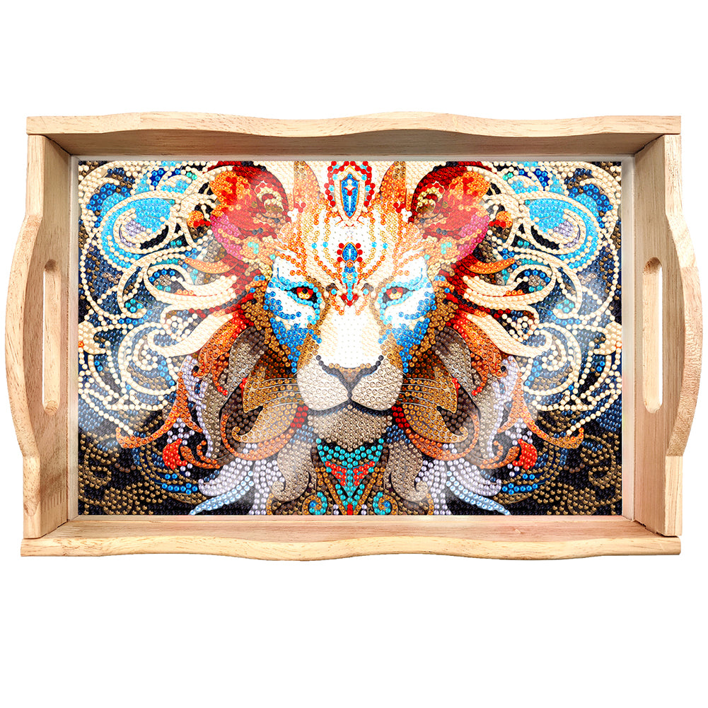 Diamond Painting Wooden Serving Tray with Handle Rectangular Wooden Tray Lion Nesting Food Trays Dinner Organizer Tray for Desktop/Coffee Table/Countertop Centerpiece