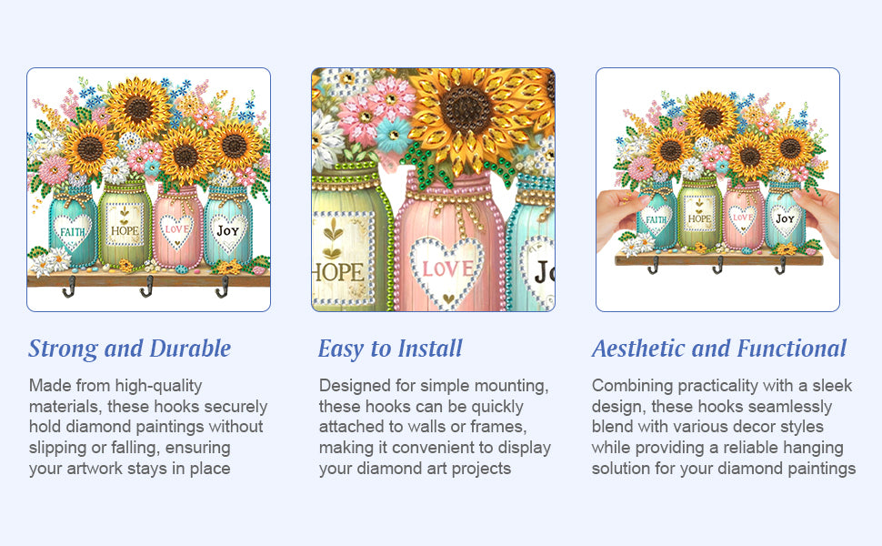 2. Heavy-Duty and Versatile: Our diamond painting hooks feature high-strength adhesives, capable of supporting heavier loads on stronger walls. Use these heavy-duty hooks as towel hooks, shower hooks, coat hooks, ceiling hooks, outdoor hooks, bird feeder hooks, key hooks, plant hooks, picture hooks, and gardening tool hangers.